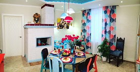 Идею проекта подсказало историческое событие — знаменитый полет Гагарина, который как раз совпал с датой приобретения нового дома хозяевами. Поэтому гостиная от «Фазенды» — это сплошной космос: яркие краски, простые формы из 60-х годов, космические обои и потолок. И еще портрет первого космонавта. Правда, совсем не там, где его можно было бы ожидать.